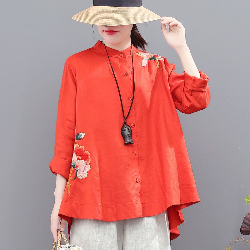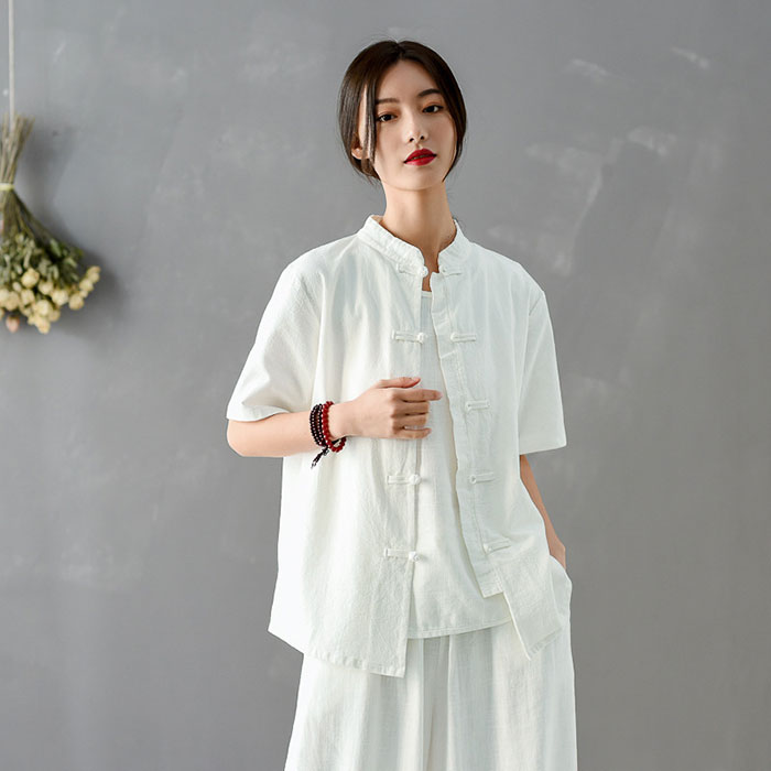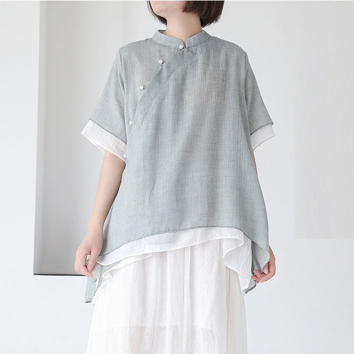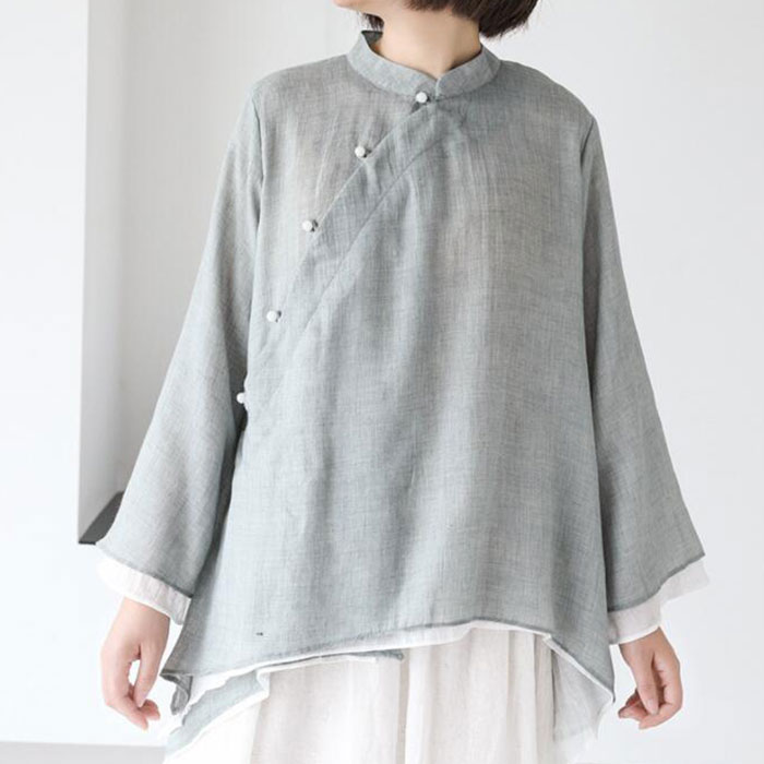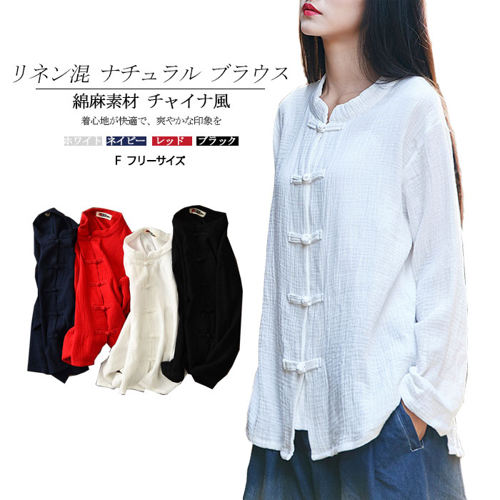 ナチュラル ブラウス レディース トップス 無地 チャイナ風 シャツ お洒落 チャイナカラー アンシメトリー 太極拳 服 ウェア