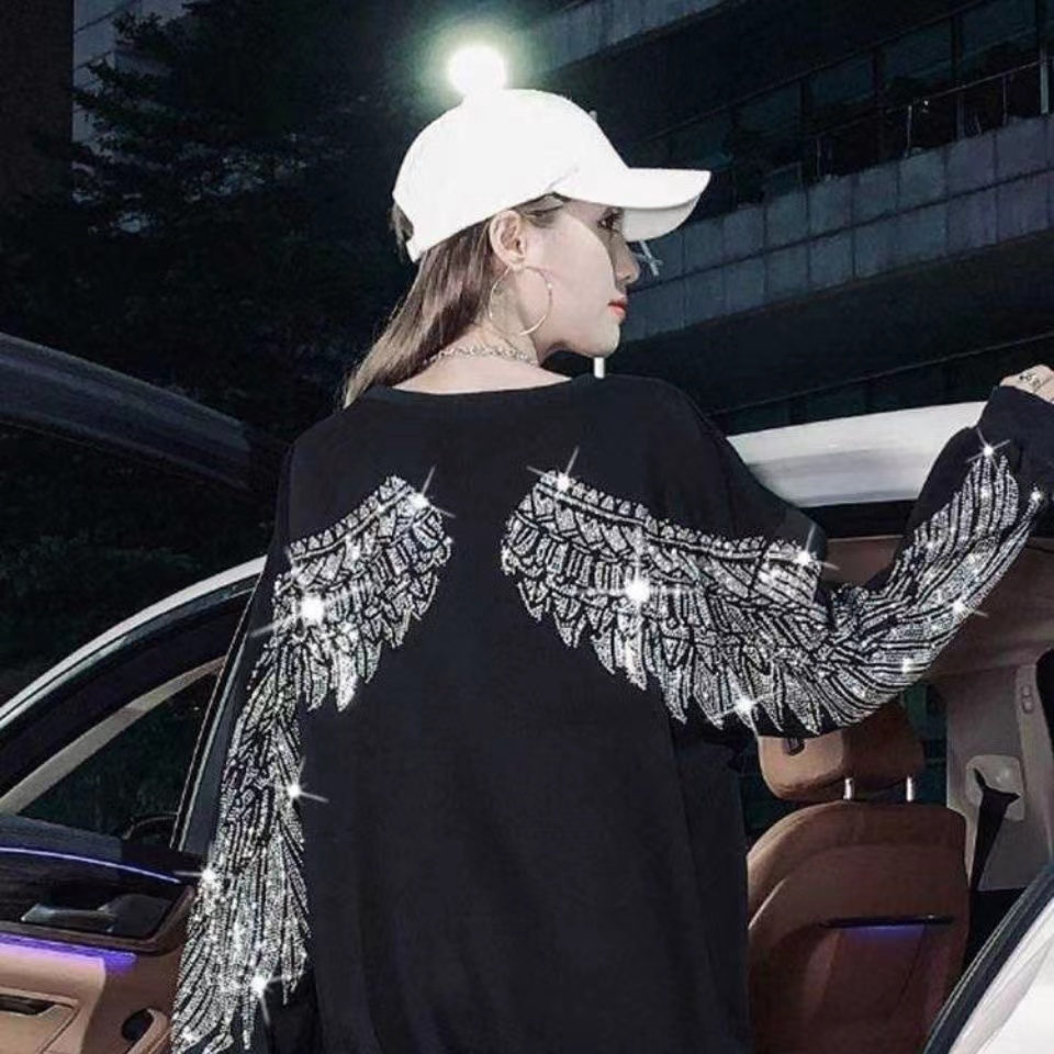 レディース カジュアルトップス 春秋薄手 ゆったり 長袖プルオーバー 韓国風 着やせトップス ロゴ カットソーストリート アメカジスウェット 着回し らくちん チュニックロン黒