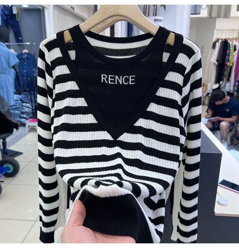 レディース トップス セーター ニット 春秋 重ね着風 ゆったり 可愛い 長袖 大きいサイズ ボーダー柄