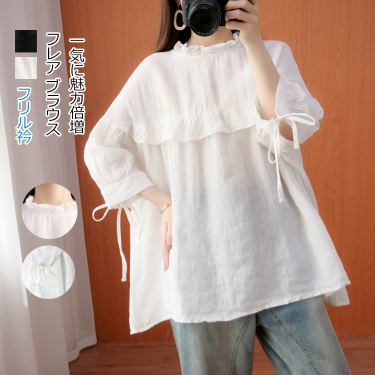 フリル ブラウス 黒 チュニックブラウス 白 前後差 フレアブラウス ワイシャツ レディース 白シャツ プルオーバー シャツ 黒 チュニック フリル襟 ブラック ホワイト 20代 30代