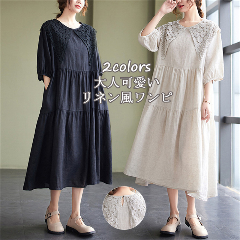 大人可愛いチュニックワンピ デザイン マキシ ロング ひんやり 通気性がいい オフホワイト ブラック フレアワンピ
