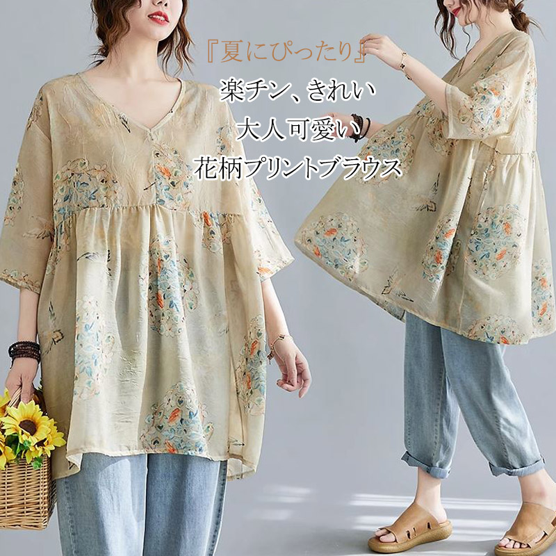 花柄 ブラウス 半袖ブラウス チュニック丈 フリーサイズ 花柄プリント フレア 涼しい 大きいサイズ ふんわり 着痩せ シャツ ナチュラル 着心地 楽ちん 20代 30代 40代 50代
