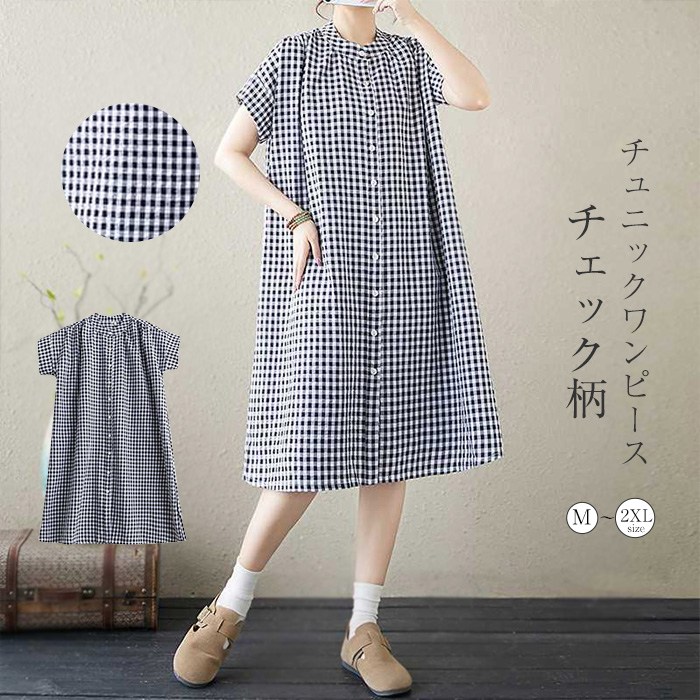 チュニック ワンピース レディース 夏 薄手 チェック柄 シャツワンピース 半袖 前開き 大きいサイズ ロング丈 ゆったり オシャレ シンプル カジュアル 着回し 着痩せ 体型カバー ルームウェア 通