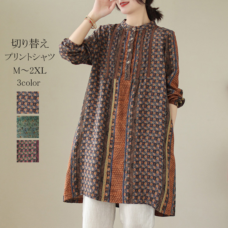 チュニック ロングシャツ チュニックシャツブラウス プルオーバー 大きめサイズあり プリント柄 2 3 4 5 30代 40代 50代