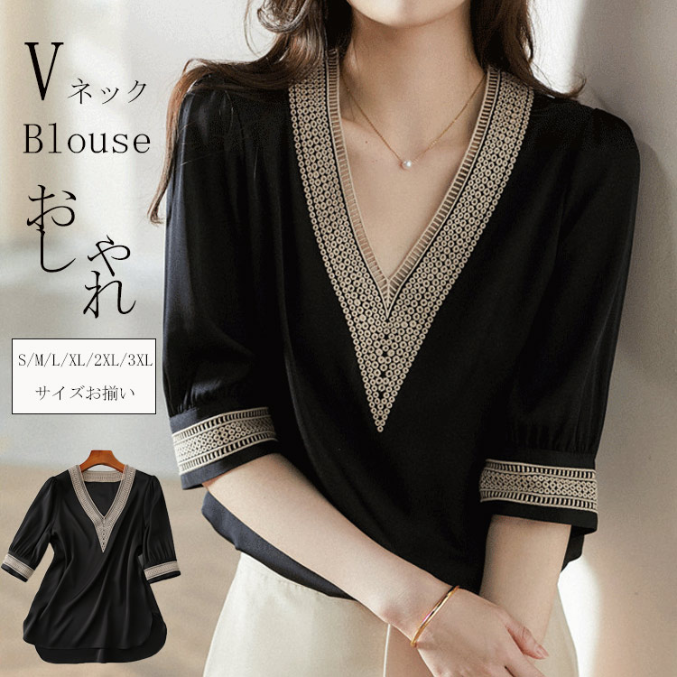 チュニック ドッキングシャツブラウス 黒 5分袖シャツ 春夏 深いvネックブラウス 切替トップス 前後差 キレイめ 大人気 おしゃれ オシャレ 正式 通勤