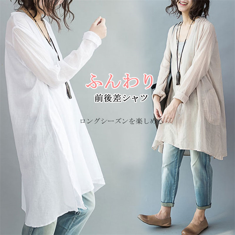 体型カバー力抜群ロングシャツ リネン風シャツ 白シャツ カット 紫外線対策 冷房対策 白 ベージュ 20代 30代 40代