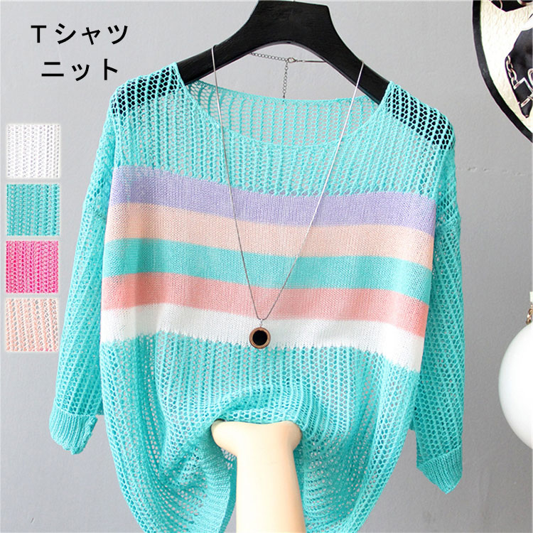 Tシャツ 夏用コート ボーダー ゆったり ニット 七分袖 色なれ 透かし彫り エアコン対策レディースファッション トップス ニット セーター セーター