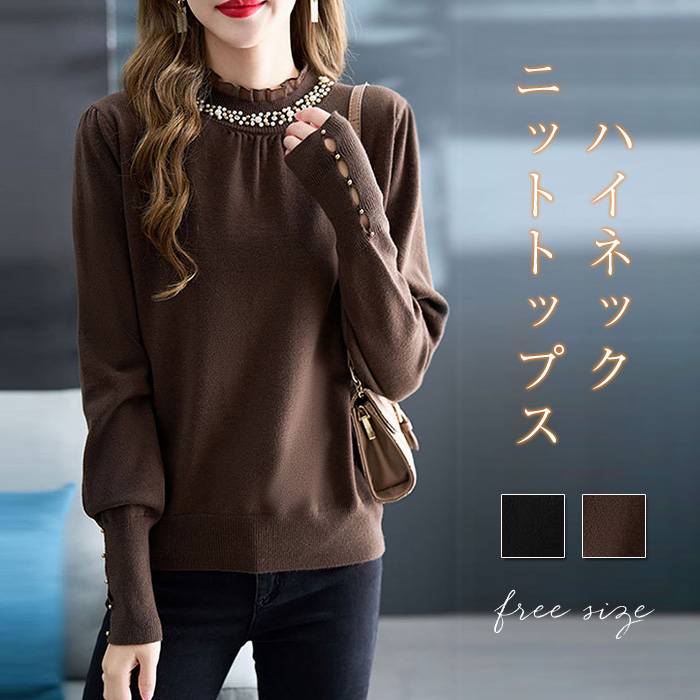 美しいボディーラインを引き立てる、フェミニンなレディースニットトップス フリル付きのハイネックが華奢な首ラインを強調、更にエレガントな印象♪