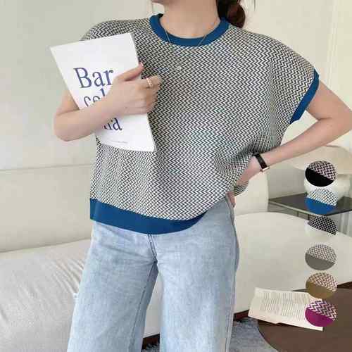 ノースリーブニットトップス きれいめ 柄ニットTシャツ ゆったり 体型カバー 半袖春夏トップス 丸首 薄手ニットソー韓国 クルーネックニット オフィスカジュアル ニットカットソー柄