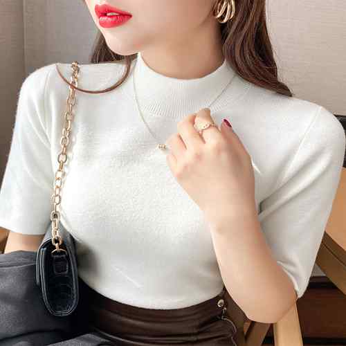 春ニット半袖 サマーニットレディース ハイゲージニット プチハイネック タイトニットTシャツ 着やせ きれいめニットソー 洗えるニット着回し ニットプルオーバー 薄手セーター細見え