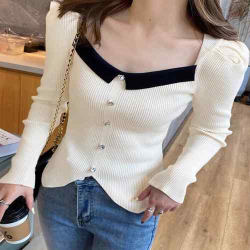 レディース 長袖 着やせ ニットウェア バイカラー フェイクボタンニット おしゃれ 普段着ニットセーター デコルテ美人 着やせ リブニット ニットソー スリム 女性トップス大人