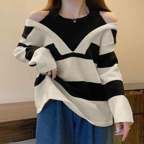 肩開き ニットプルオーバー レディース レイヤード風 ニットセーター 重ね着風ニットトップス 肌見せトップス バイカラー 肩出し ニット長袖 着回し ニットソー 体型カバートップス