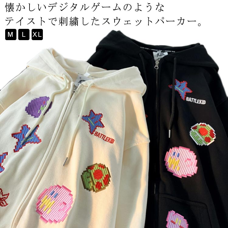 スウェットパーカー 刺繡入り マルチ柄 マルチカラー ジップパーカー 前開き フーディー ストリート アメカジ