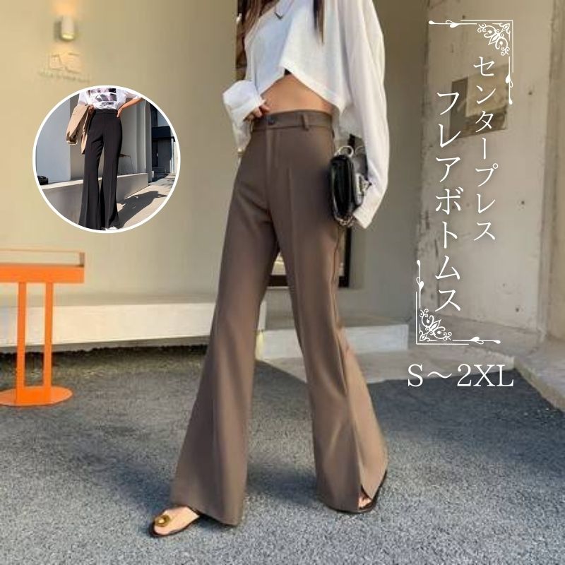 ロングパンツ 春 秋 レディース ブーツカット 裾スリット 無地 20代 30代 40代 ママ会 お出かけ 女子会 デート 普段使い 休日 OL オフィス キャンパス 通学
