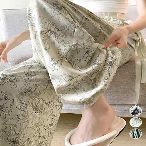 ストレートパンツ ウエストゴム イージーパンツ 体型カバー 冷感タッチ ボトムス ハイウエスト 韓国風 美脚ロングパンツ さらとろボトムス夏 薄手パンツ 涼しげ 楽チンパンツ 花柄