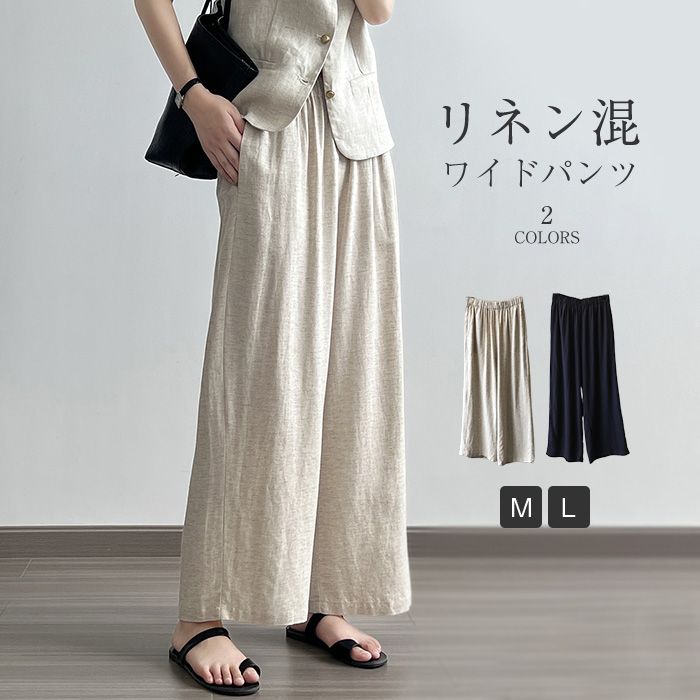 リネン素材で穿き心地抜群♪清涼感のあるボトムス ワイドパンツ レディース リネン 麻 ウエストゴム 女性 ファッション 体型カバー 着回し 春 夏 リネンタッチ
