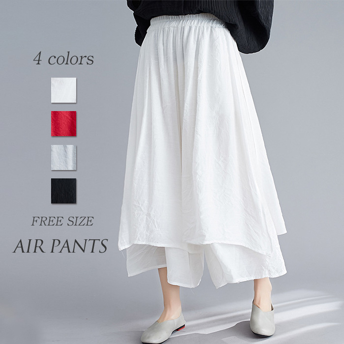 季節感アップル 綿麻風 2枚見え ワイドパンツ ブラック レッド ホワイト グレー プレゼント 贈り物 ギフト 母の日 春夏 フリーサイズ 薄手 無地 シンプル 涼しい ケア ♪