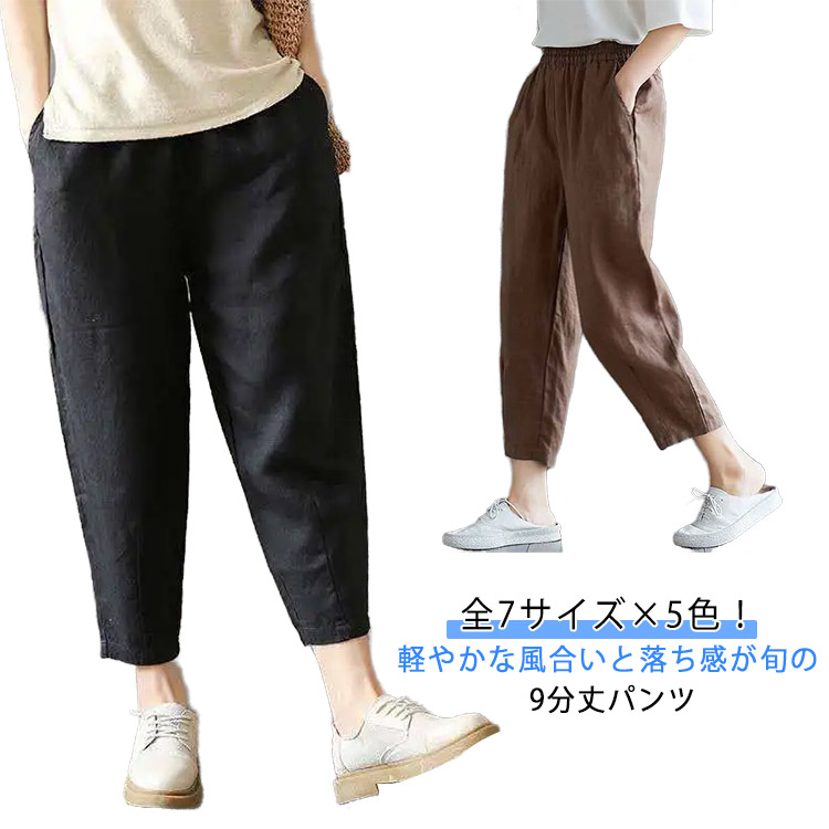 サルエルチノパンレディース テーパードパンツクロップドパンツ ゆるパンツ パンツ ウエストゴムリネン麻ボトムス ゆるパン大きめ9分丈7分丈 S ML2L