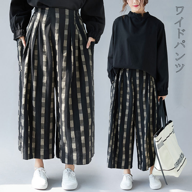 チェック柄ワイドパンツ 9分丈 体型カバー ゆったり ストンとしたシルエット カジュアル リラックス 母の日 ママパンツ