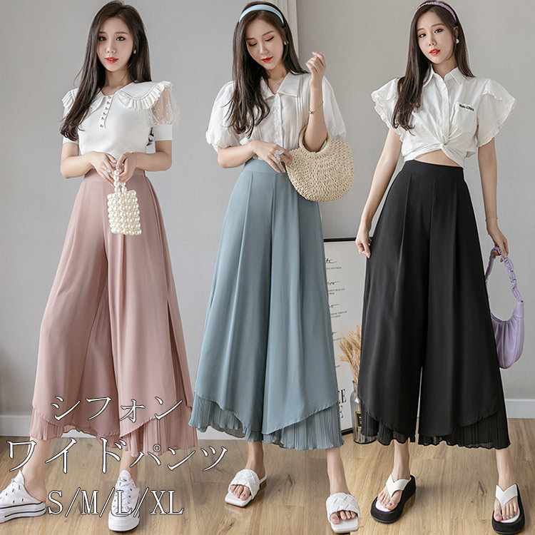 シフォンワイドパンツ ロングパンツ 夏着 薄手 後ろゴム 抜け感 カジュアル 涼しい サマーパンツ スベスベ 大人気 オシャレ お洒落 きれいめ 黒 ピンク ブルー
