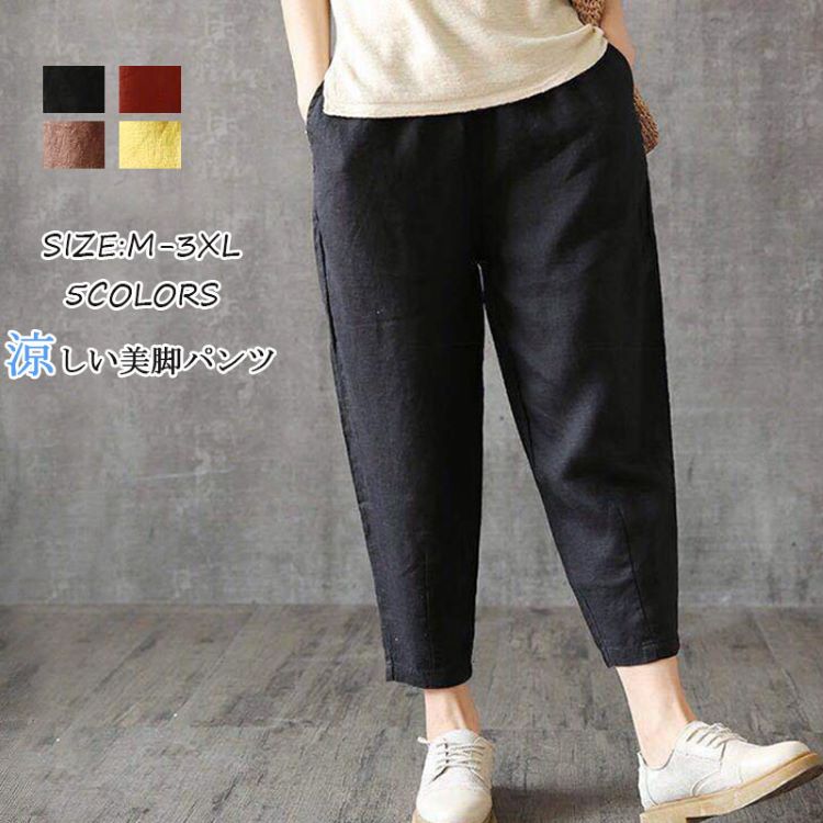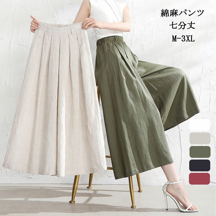 綿麻パンツ ワイドパンツ クロップド レディース 夏着 ハイウエスト ウェストゴム 無地 白 黒 赤 緑 ベージュ カジュアル