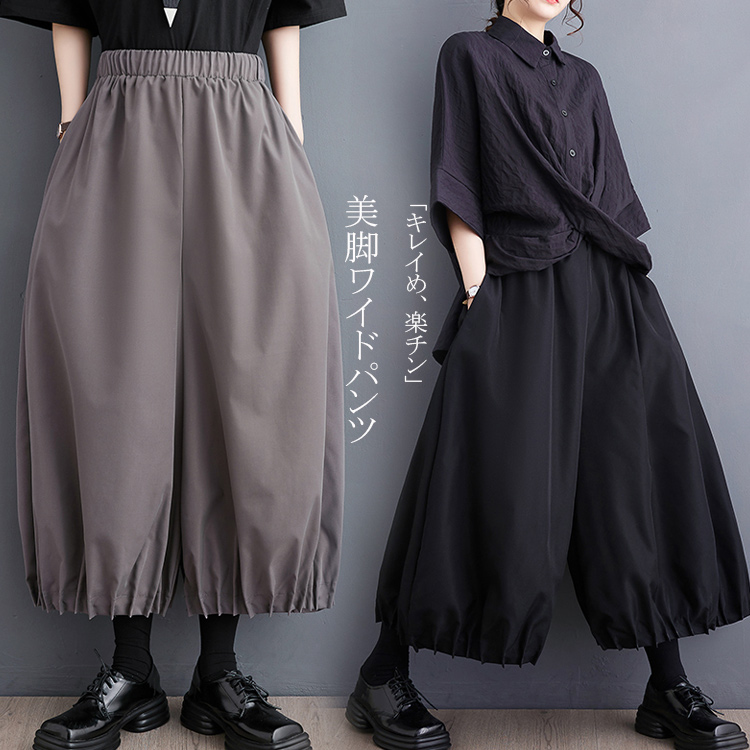スラックス イージーパンツ ワイドパンツ レディース 春 夏 秋 ボトムス ズボン 美脚パンツ 体型カバー シャーリング 着痩せ ゆったり フリーサイズ リゾート シンプル 黒い