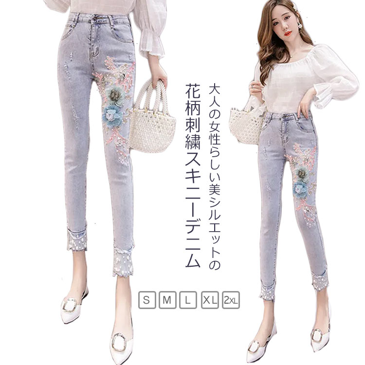 レギンス スリムパンツ デニムパンツ 美脚&ストレッチ抜群 刺繍パンツ ジーンズ ロールアップレディースファッション ボトムス パンツ