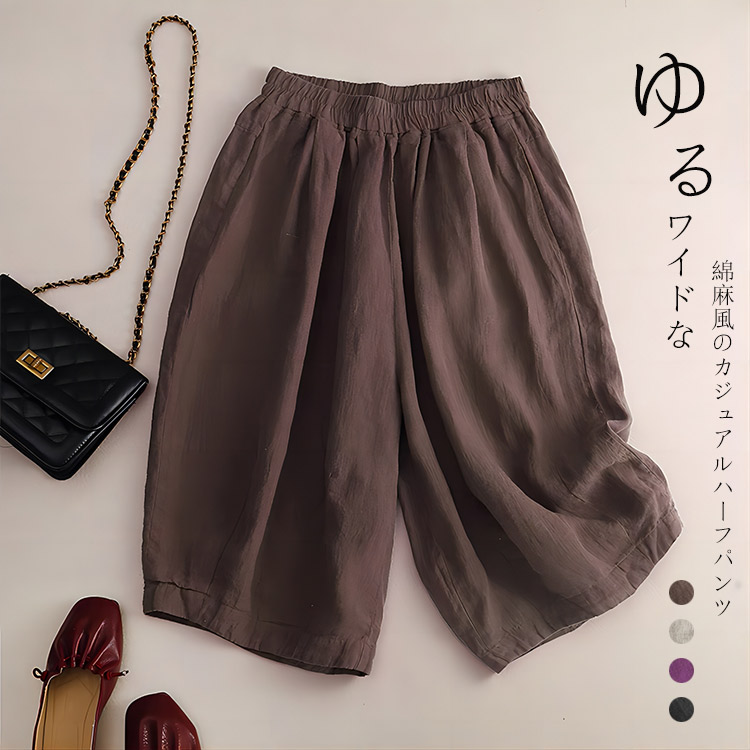 ハーフパンツ リネン風 パンツ 5分丈 サマー キュロットパンツ ハーフ丈 レディース 夏 カジュアル 無地 ポケットづき 涼しい 快適 M L XL 2XL