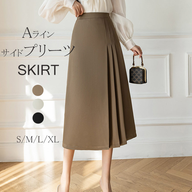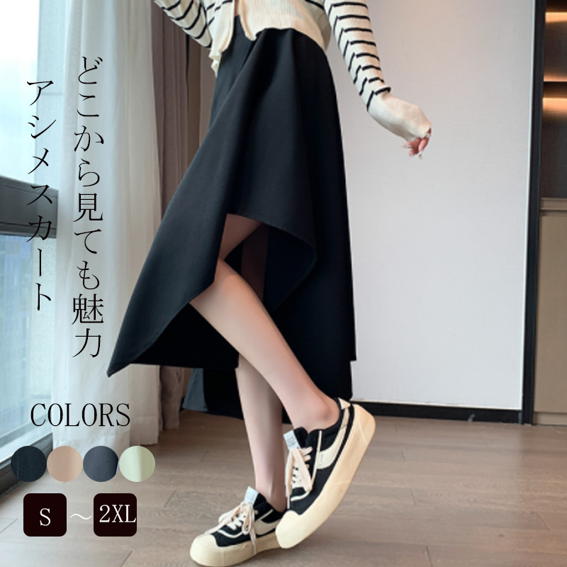アシメスカート レディース 春夏 スカート Aラインスカート フレア裾 ミモレスカット プリーツスカート アシンメトリー キレイ ブラック グリーン グレー グレージュ 黒 体型カバー