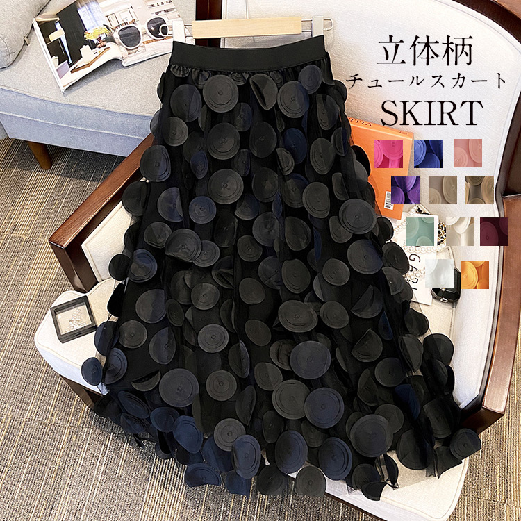 12色立体柄づきデザインスカート ふんわりボリュームチュールスカート マキシスカート チュール 着こなせ オールシーズン 上品 黒スカート ロングスカート ライン カラースカート
