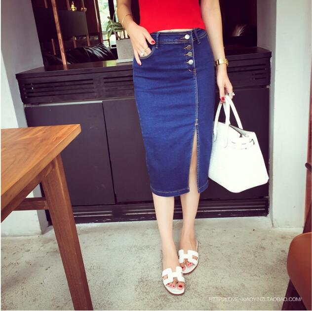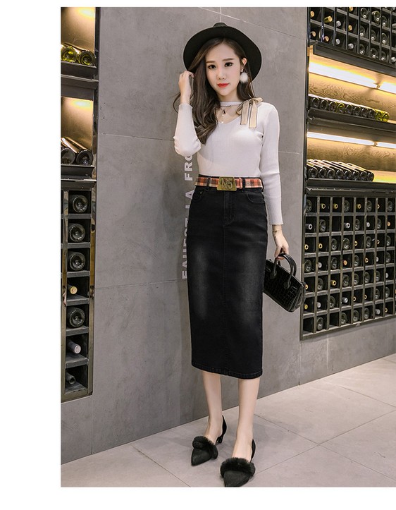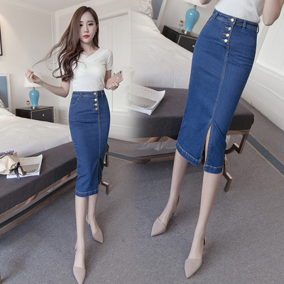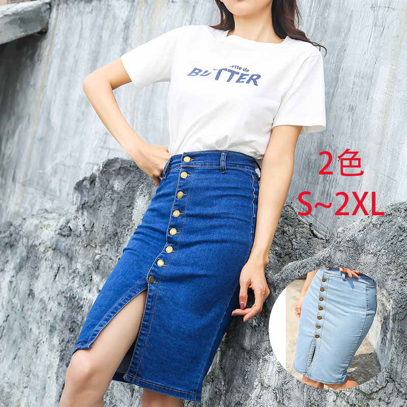 女性らしいシルエットのデニムスカートスリット入りで歩きやすい&セクシー前タンがオシャレ スッキリとしたライン韓国ファッションコーデしやすい ジーンズ生地