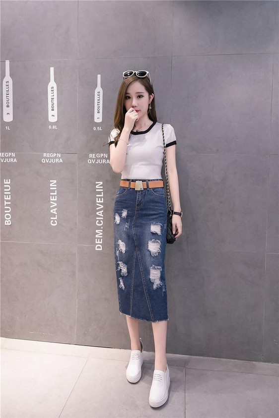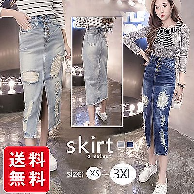 デニムスカート スカート フロントスリット スリム レディース ダメージ ロングスリット ミモレ丈 韓国風 ファッション