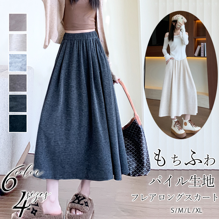 パイル生地 フレア ロングスカート レディース 秋冬 ボトムス パイル地 ゆるふわ スカート ロング丈 ミモレ丈 ウエストゴム 楽ちん ゆったり 脚長効果 ふわもち ライン