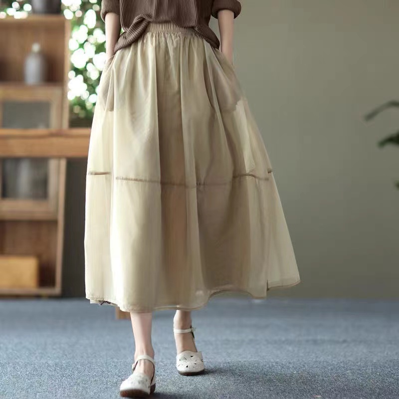 レディース ロングスカート 春夏 ハイウエスト 通勤 薄手 可愛い 無地 カーキ 杏色 ブラック 017