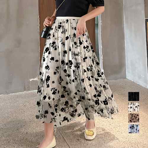 裏地付き メッシュスカート レディース ウエストゴム フレアスカート 春夏 体型カバーきれいめ ロングスカート ふんわり 大人可愛いスカート フェミニンオシャレ 着やせスカート通勤
