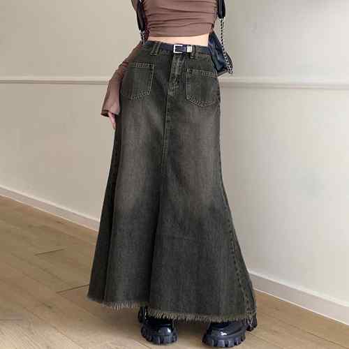 ロングスカートレディース バックスリットAラインスカート 切りっぱなし フリンジヴィンテージ加工スカート オールシーズン ハイウエスト 美脚 大人着回しスカート 着やせデニムお洒落