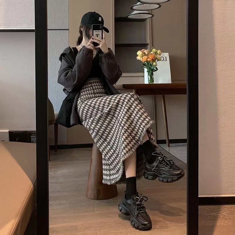 レディース ニットスカート ロング 秋冬 チェック柄 通勤 厚手 ボトムス 可愛い グレー 杏色 ブラック コーヒー S M L XL 2XL SLKA040