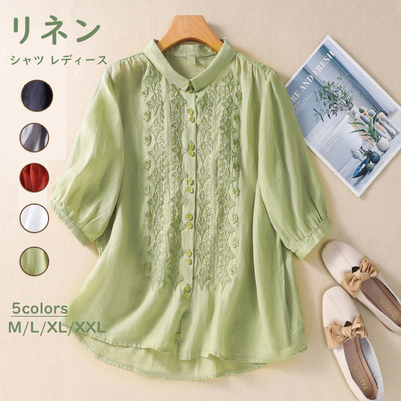 カジュアル 大人可愛い お出かけ 旅行 綿麻 7分袖 無地 体型カバー 着痩せ お洒落 トップス 大きいサイズ ゆったり シンプル 薄手 刺繍 花柄