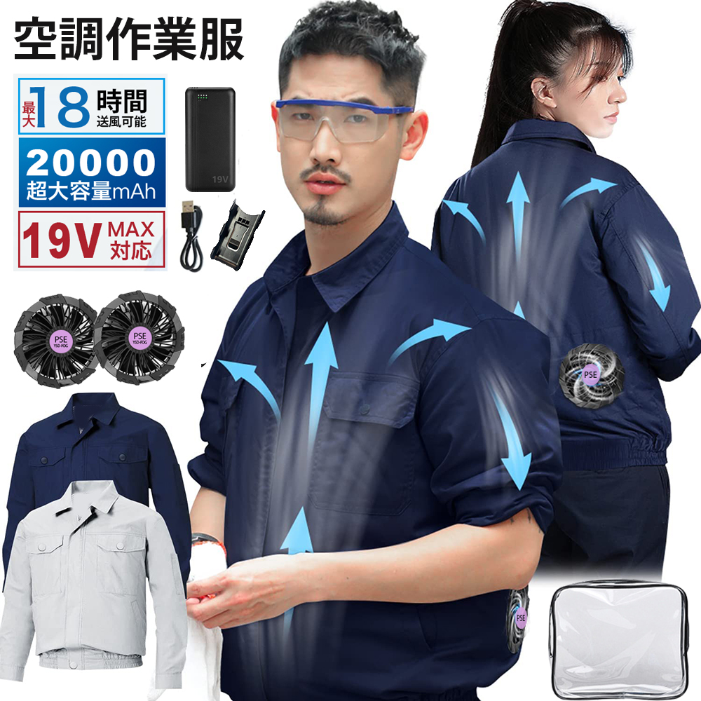 扇風ウェア 男女兼用 夏 猛暑対策 空冷作業服 扇風服 19Vファン 屋外作業 長袖 20000mAh バッテリー付属 5V出力 USB給電式