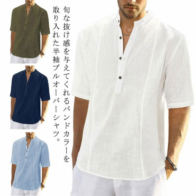 半袖シャツ メンズシャツ 立ち襟 リネンシャツ 無地 薄い 夏シャツ お兄系 ヘンリーネック カジュアルシャツ