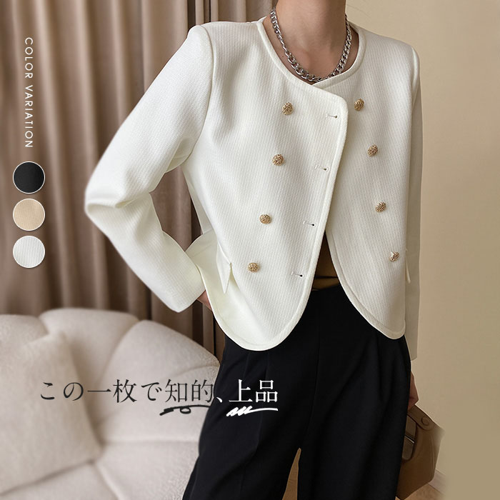 女性らしいメリハリシルエット♪ツイードにシンプルなノーカラーが大人上品なジャケット コーデ次第で幅広いシーンに大活躍