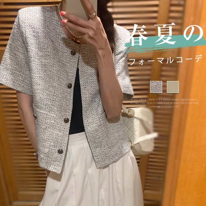 クラシック風 半袖 ツイードジャケット 春夏 春秋 ベージュ グレー 20代 30代 40代 50代 プレゼント 贈り物 ギフト 誕生日 母の日 二つの腕カバー 着瘦せ 上品 大人かわいい ♪