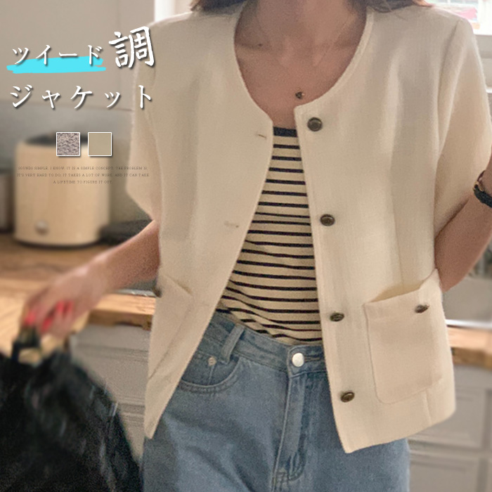 クラシック風 半袖 ツイードジャケット 春 夏 秋 ベージュ グレー お呼ばれ パーティー 結婚式 デート 通勤 オフィス 母 母親 ビジネス フォーマル 女子会 フリーサイズ ♪