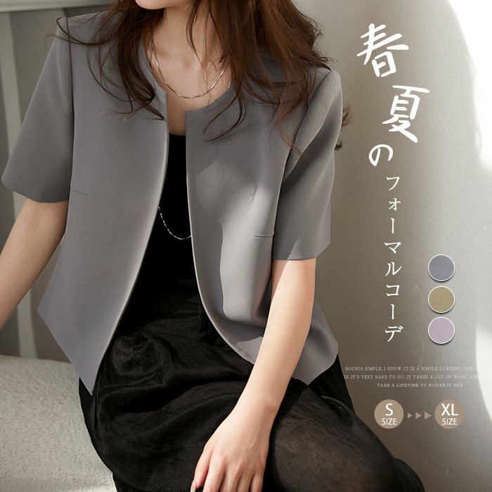 半袖ノーカラージャケット 春 夏 秋 グレー ベージュ パーブル お呼ばれ パーティー 結婚式 デート 通勤 オフィス OL 母 母親 ビジネス フォーマル ♪