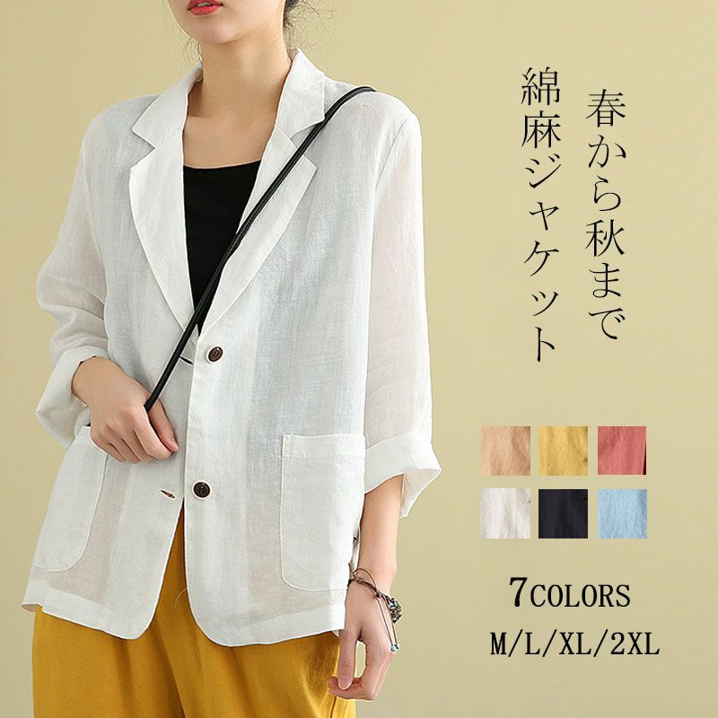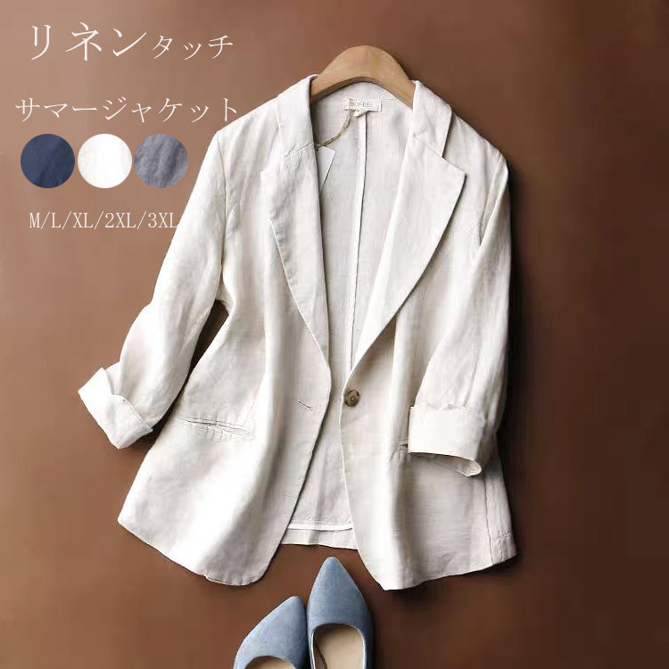 自然な風合いの綿麻タッチ 薄手テーラードジャケット サマースーツ カジュアルスーツ シンプル 通勤 オフィス 夏羽織りもの