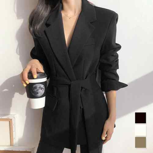 スーツジャケット ベルト付き ボタンレスジャケット ポケット付き オフィス ミディアム丈軽アウター 裏地付き 体型カバー 黒スーツ30代通勤 ライトアウター韓国 大人上品長袖着やせ