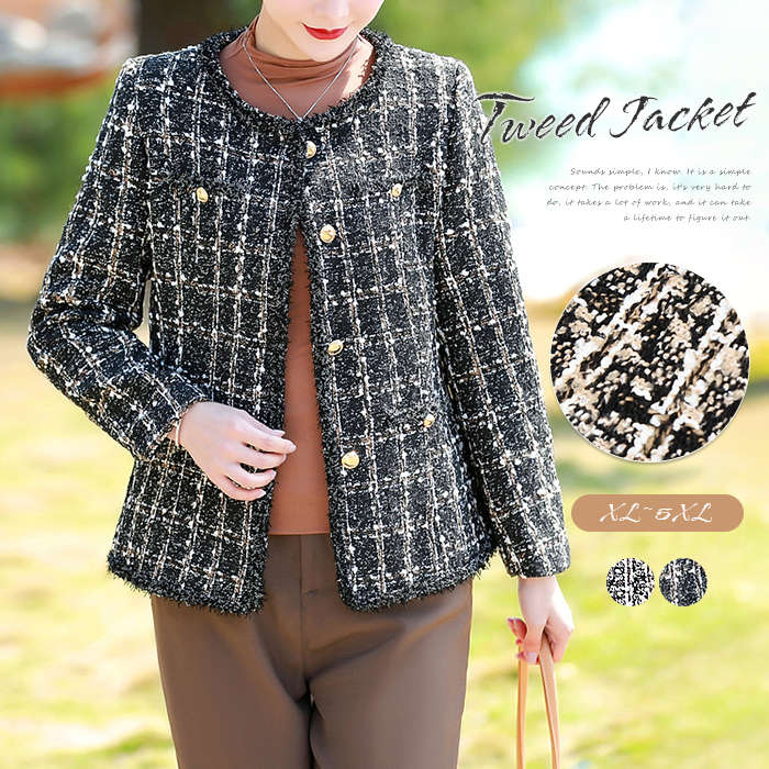 驚きほど 高品質 ノーカラーツイードジャケット Tweed jacket XL 2XL 3XL 4XL 5XL 大きいサイズ ブラック 黒 ブラウン 茶 ♪