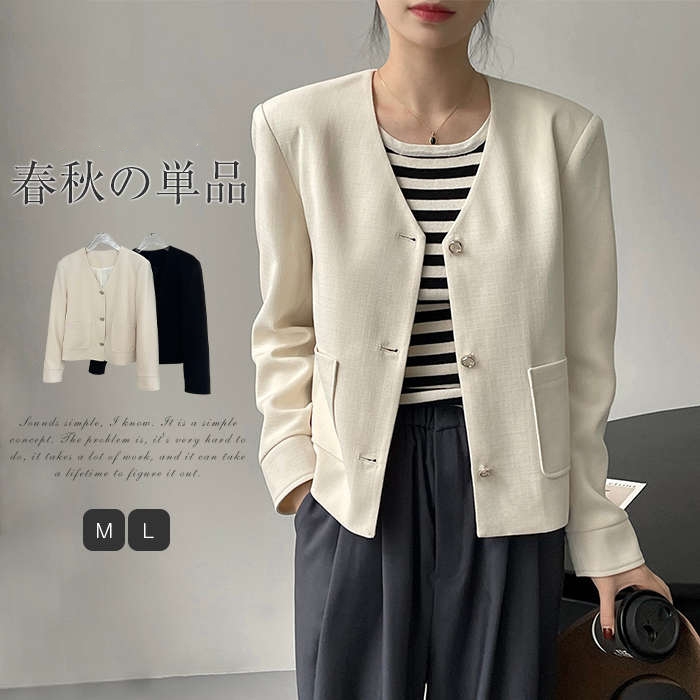 着回し力抜群 ポケット付き Vネック ノーカラージャケット 20代 30代 40代 50代 ブラック 黒 ホワイト 白 ♪