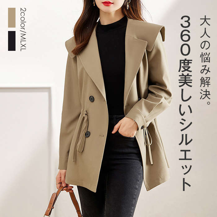 ダブルブレストジャケット ミディアム丈春コート ポケット付きスーツジャケット 春秋ライトアウター パイピング 軽アウター ジャケットおしゃれ スプリングコート黒 体型カバー 着やせ