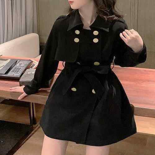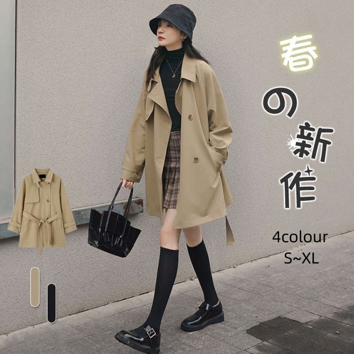 ミドル丈トレンチコート カジュアルきれいめライトアウター ベルト付きスプリングコート 韓国軽アウター お洒落通勤服 春秋 フェミニンコート黒 ダブルボタン着やせ 大人女性ジャケット